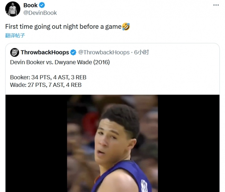 布克转发并表示:“(这是我)第一次比赛前一天晚上出去玩儿😂”